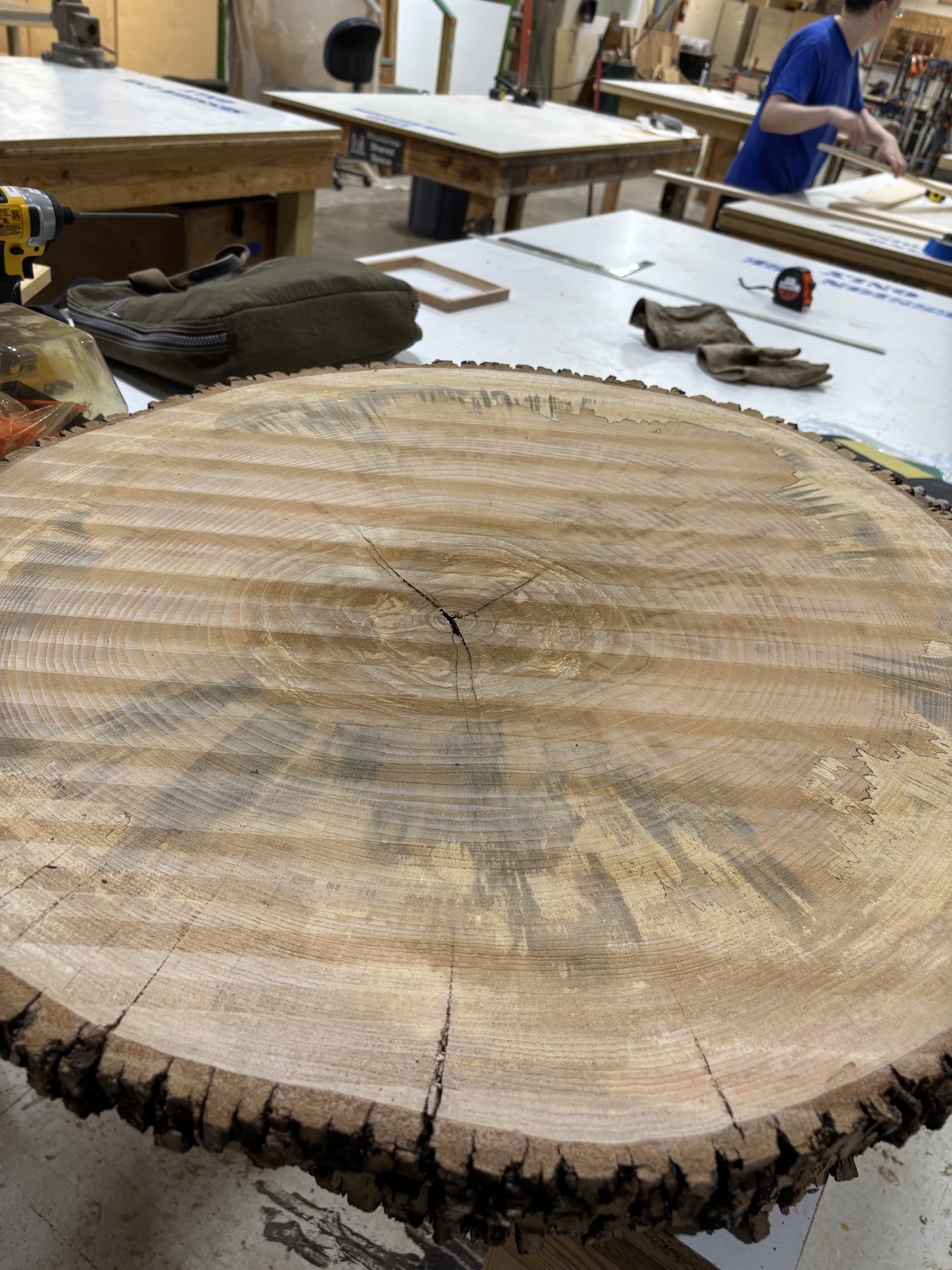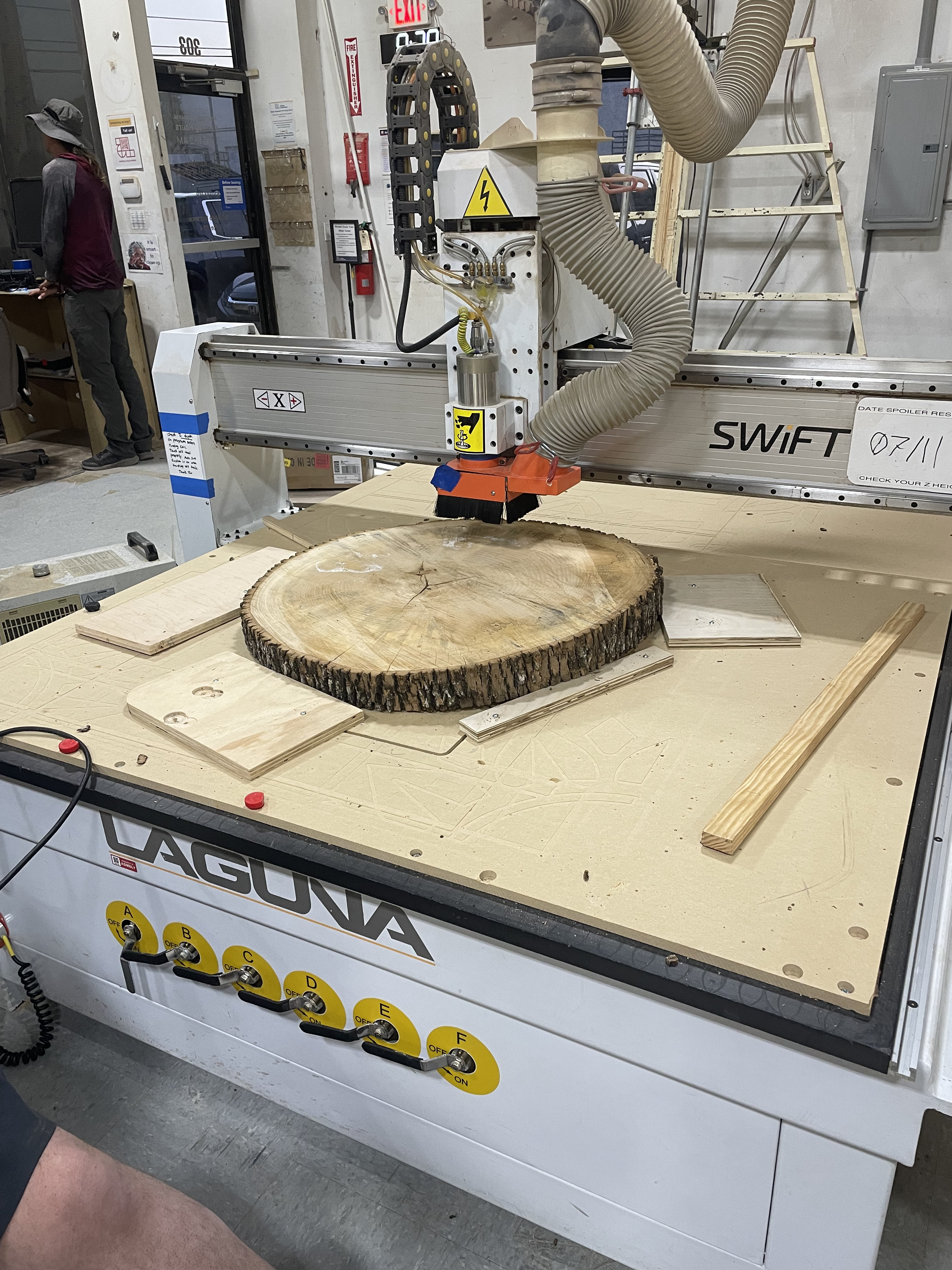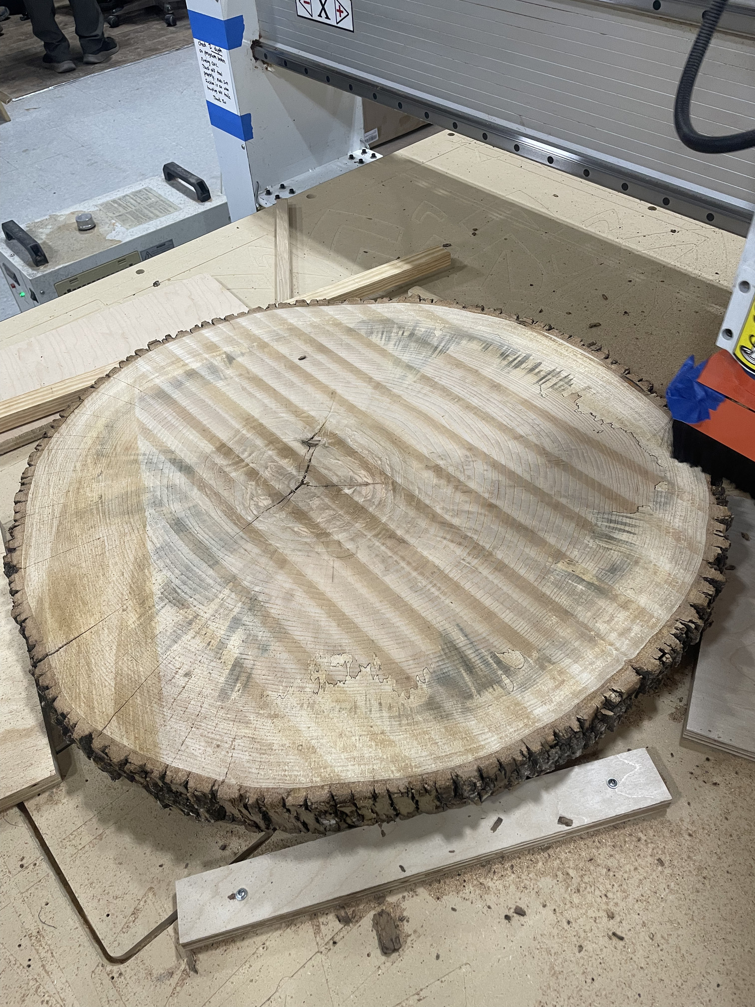 But the stars of the haul are two large cookies (Elm? Ash?) that will be my immediate focus. They’re roughly 32” in diameter and end-grain, making them a perfect candidate for demonstrating the CNC’s flattening capabilities.