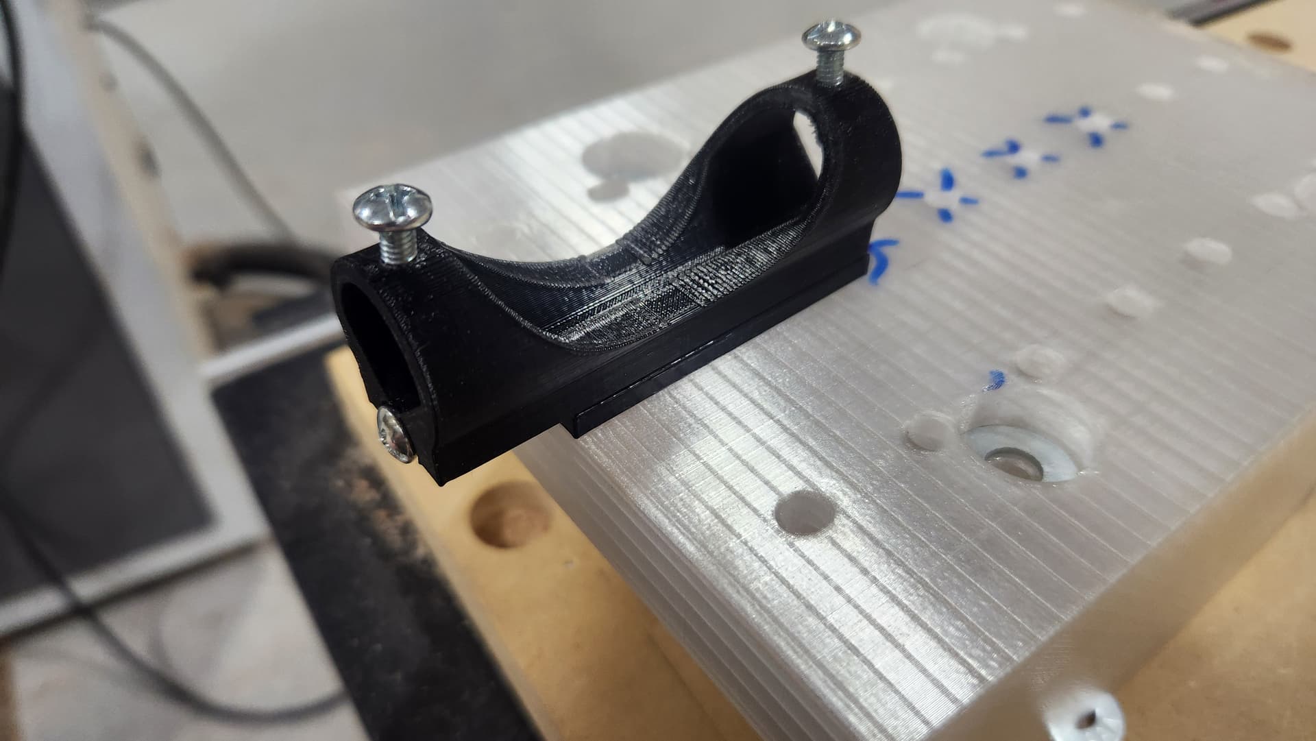 For some work I’m doing with the large and small CNCs I have created a mount plate for attaching various other “secondary” tools - for example, a pen, a brush, etc. The mount is 3D printed in PETG and snugly fits directly on the front of either of the CNC’s spindle mounts. Its array of holes are for 1/4”-20” or 6 mm bolts (actual hole diameter is 6.5 mm). The column of holes are 40 mm apart, and the rows are 25 mm apart. Note: The bolts shown in the picture has been shortened and are now flush with the surface of the mount plate.