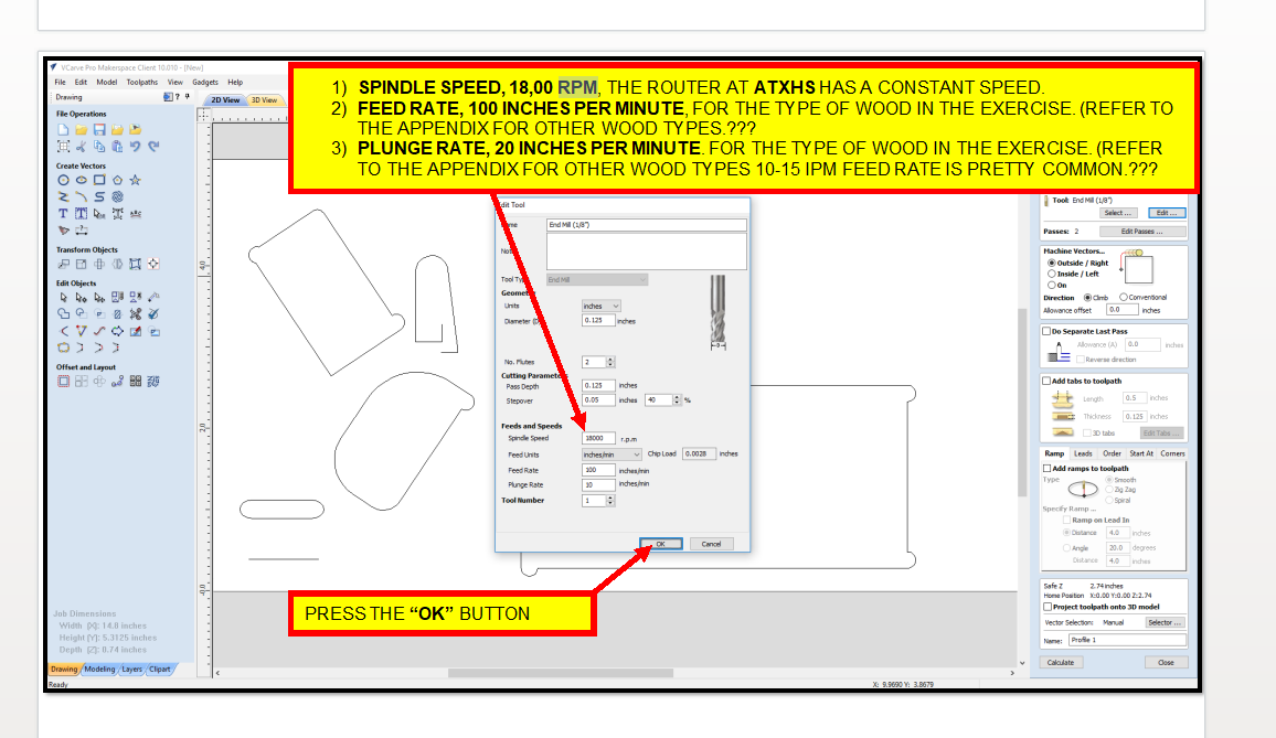 I broke a bit yesterday using a generic looking ‘softwood 1/4” end mill’ profile because its feed rate was set to 6 inches per second (360 inches per minute). I will absolutely concede that this is my fault for not checking every single parameter, especially since I’ve come across this exact problem before. But why was that tool setting in the library? What maniac is cutting at 360 inches per second with a 1/4” bit?! I wouldn’t try to cut marshmallow with that combination. Needless to say my bit snapped like a toothpick at that rate even though I was only cutting 1/4” deep into pine.