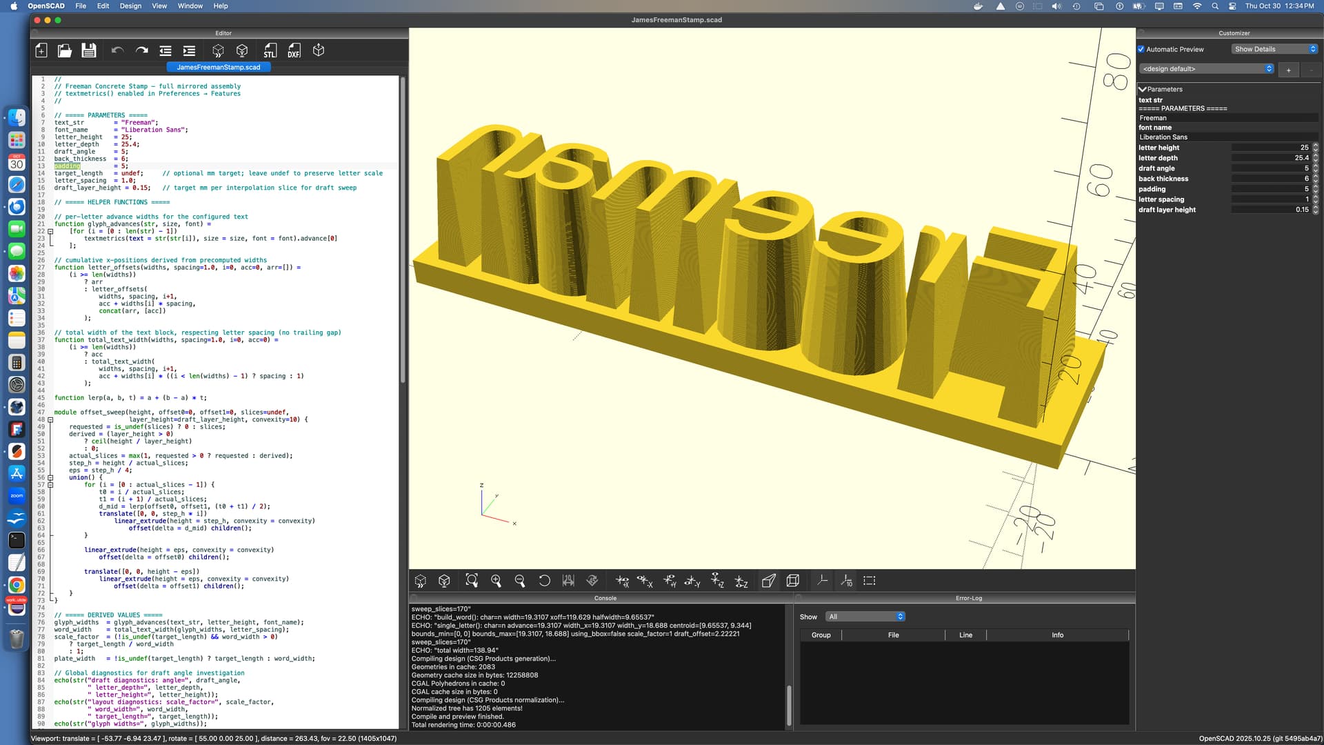 Evan @flowmage, Indeed I had to enable the fontmetrics extension in my preferences for sure! You should have read my prompts to ChatGPT when it never said I needed to set the preference - grrrr. There are times I YELL AT CHATGPT - sometimes it is so stupid and at others so smart! Then to get the draft angle balanced on left and right it did even more gyrations of creating pseudo-slices, but it worked. You’ll have to read the code to find out the exact technique it used. Send me an email to bwatt@1fifoto.com and I’ll send you the JamesFreemanStamp.scad file.