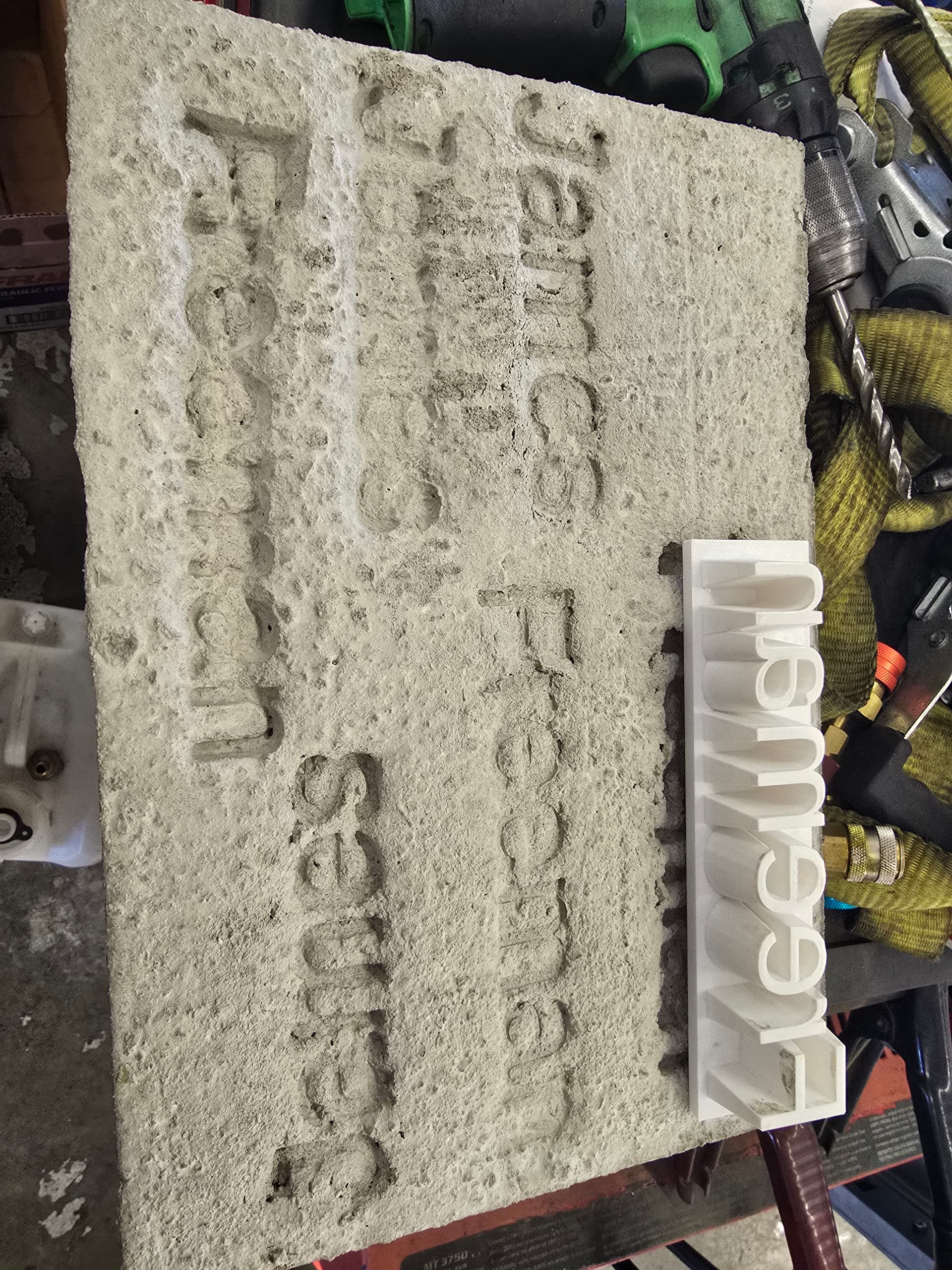 My wife and I are donating some concrete work to our son’s school, and wanted to leave our mark in it. After seeing a Facebook video of someone using a 3d printed stamp to leave their name in concrete, I knew that’s what we wanted.