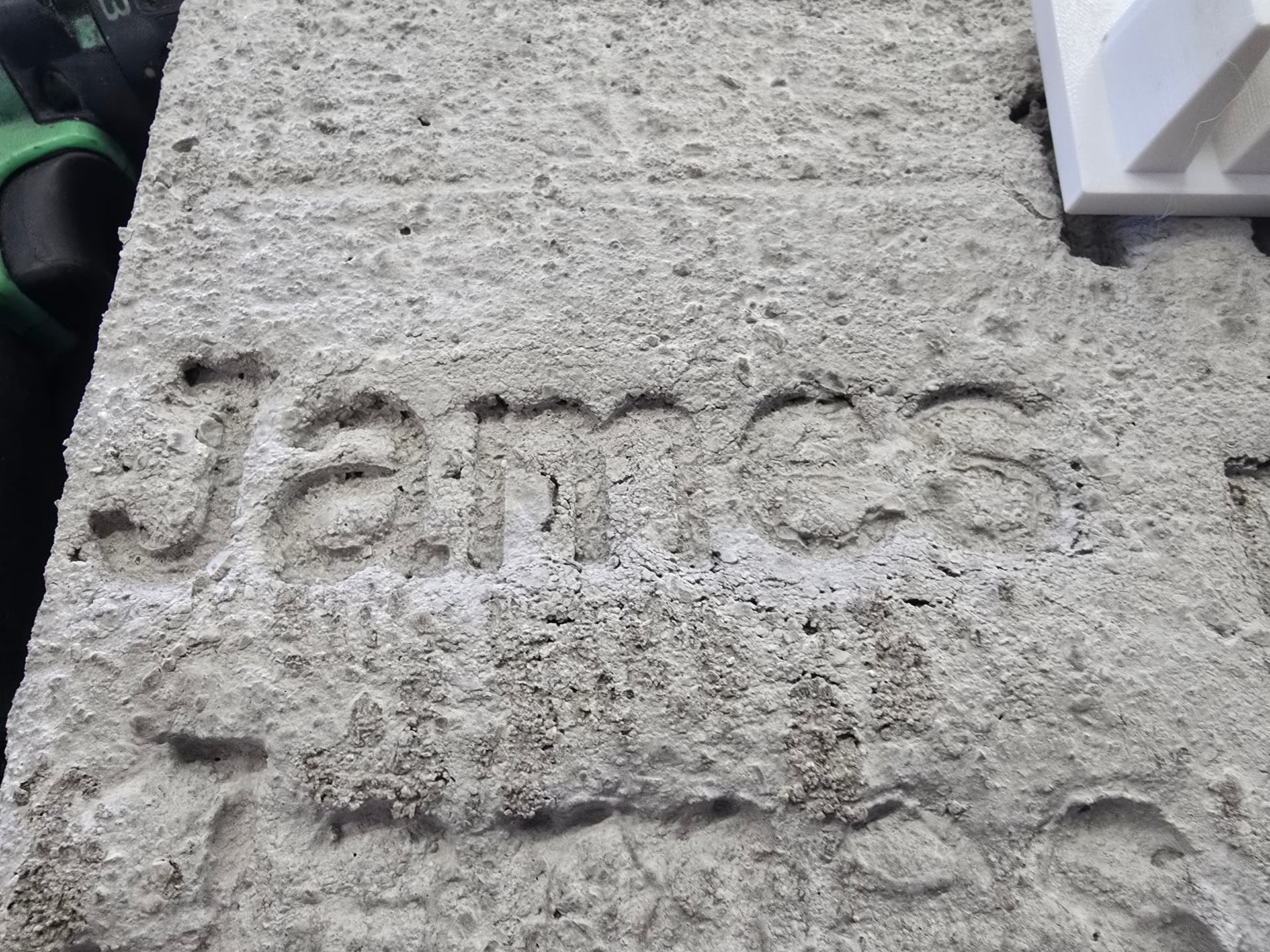 We met at Asmbly last night so I could conduct a very crude test run. The stamp worked perfect. With better concrete finishing I’m confident the stamp will give perfect results! And don’t worry, we’ll also have our son leave his hand print.
