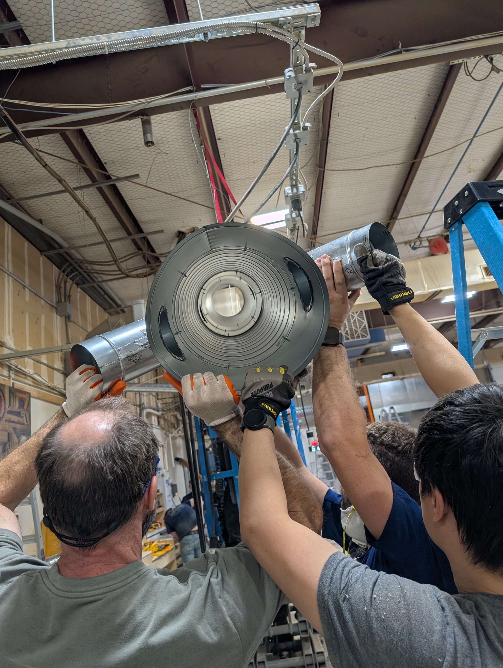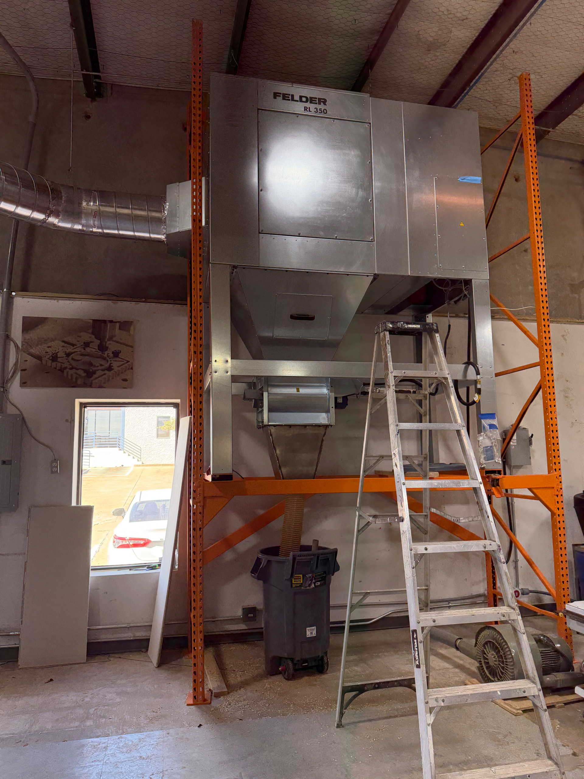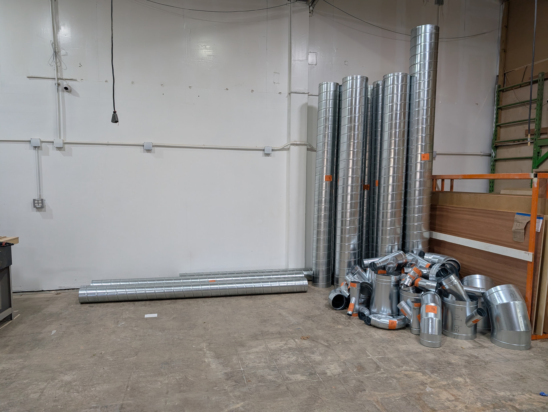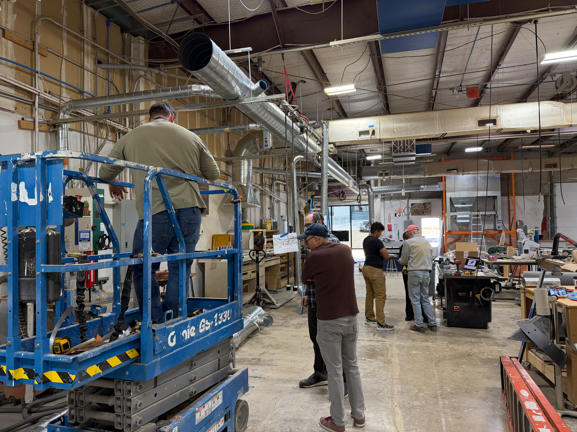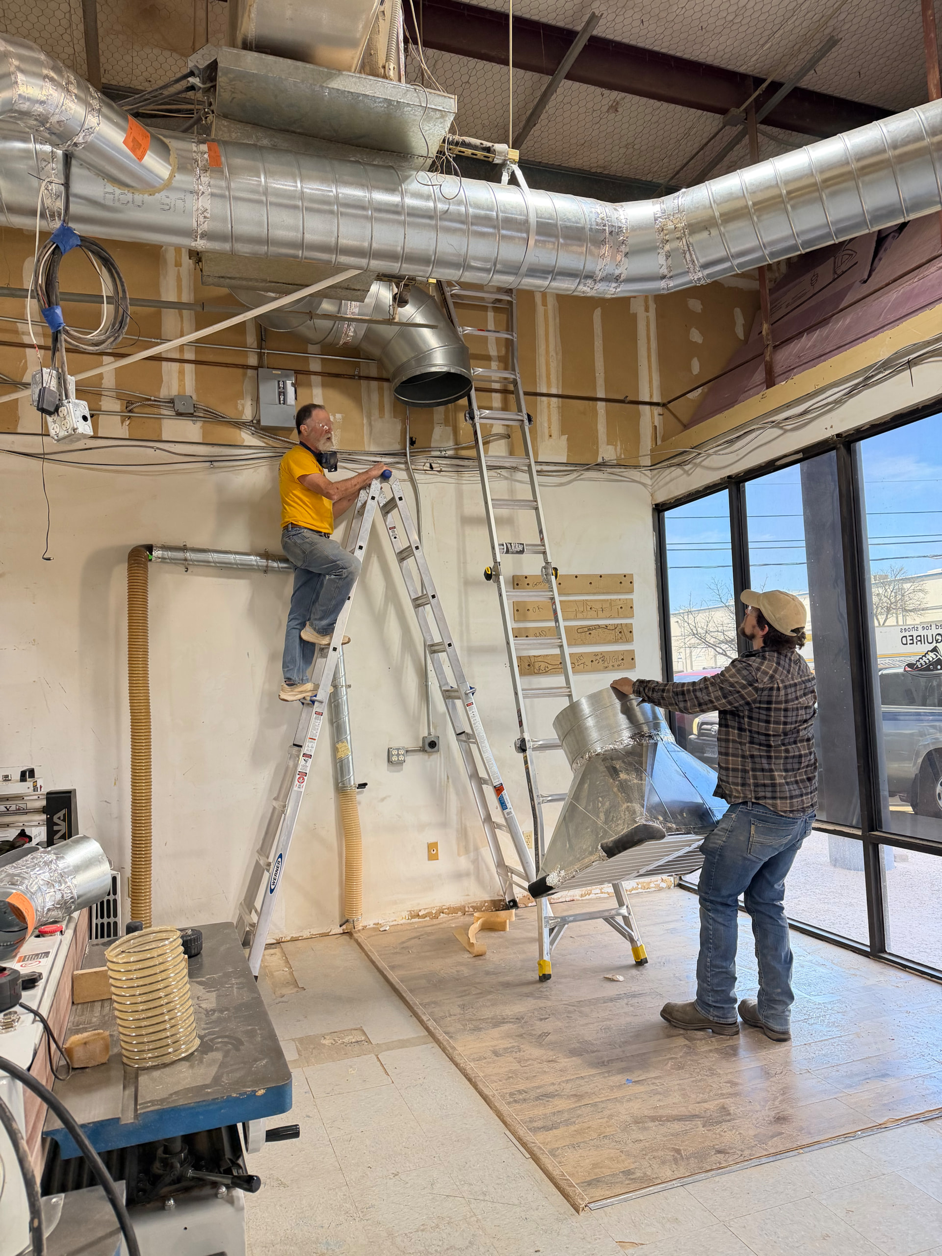 Saturday was another exciting and extremely well progressed day. We quickly dropped the T-Flux, the existing pipes, cleaning as we went. While the row of tools was clear we attacked a few other great wish-list items such as moving the table saw power plugs up high, correcting the low hanging hvac return by the small CNC, and removing all of that old dusty fiber glass above the CNC window.