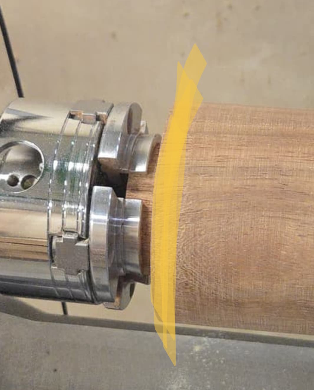 Thank you for sending the photos. When your piece is clamped in the Chuck, ideally it is touching that yellow line. I’m drawing on the photo. That is the shoulder of your piece. In other words, your tenon is too long. Shorten it just a little bit. So when your piece is in the Chuck, it is not only clamped around the tannin, and the shoulder is pressed up against the top of the Chuck clamps.