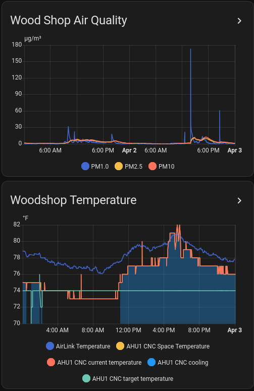 We have four total Davis Airlink devices in the woodshop, laser room, ceramics area and the kiln room. These are solid accuracy and quality for the critical areas where they’re deployed. But they’re also much more expensive than the DIY options, so not adding them all over the place makes sense.