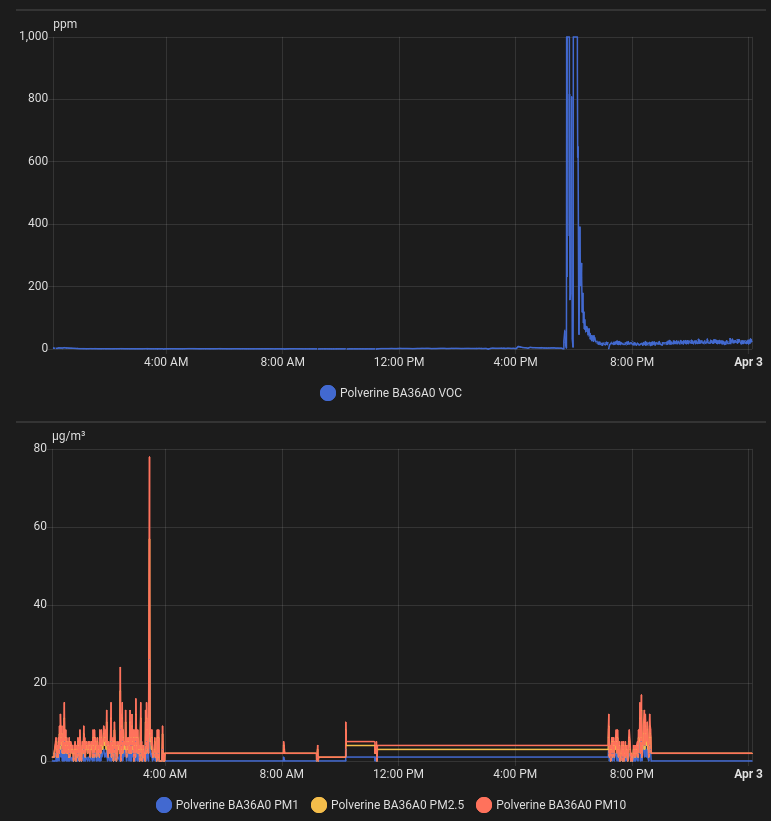 A couple of people had done some more comprehensive measurements for a while about two years ago. One result was a big spike in both VOCs and particulates when people were welding. That was why we made welding ventilation a big focus in the new metal shop. It would be interesting to see similar measurements now.