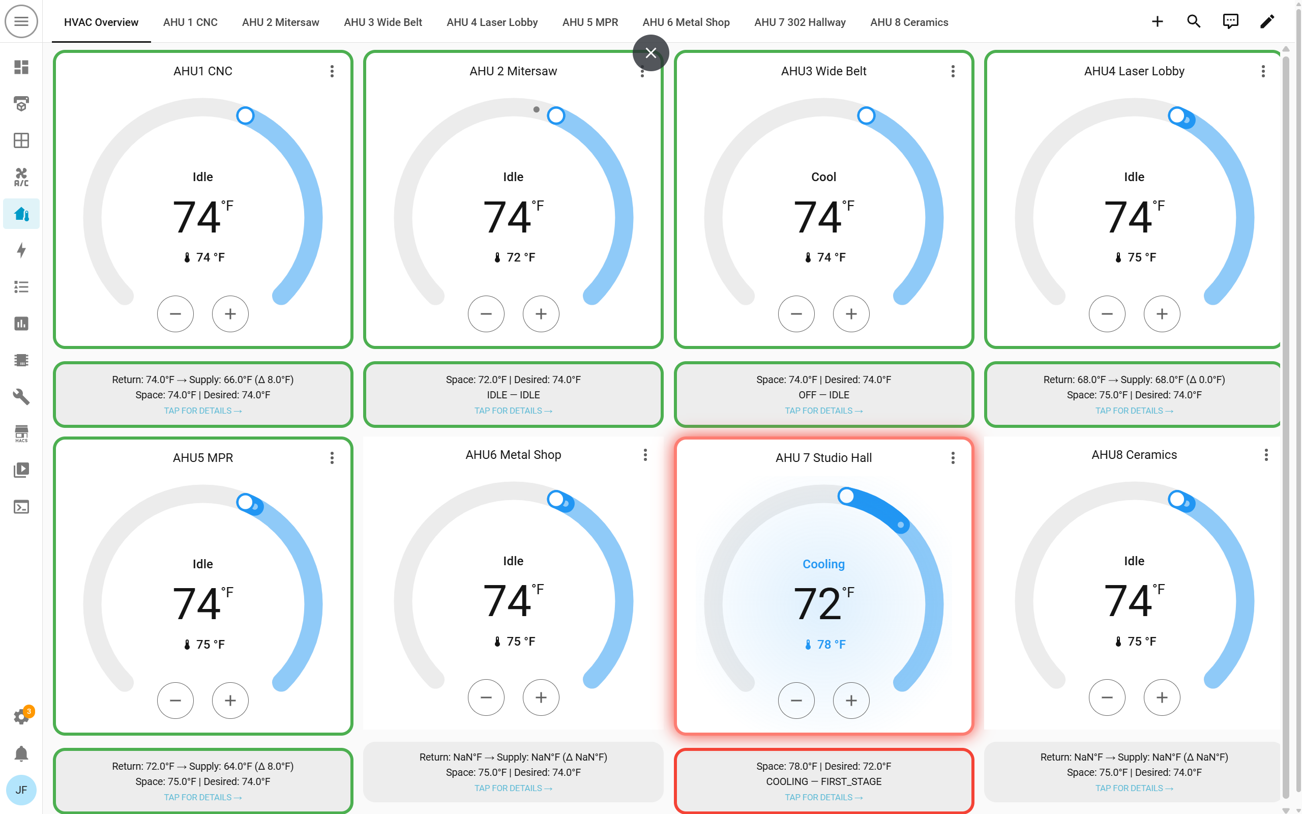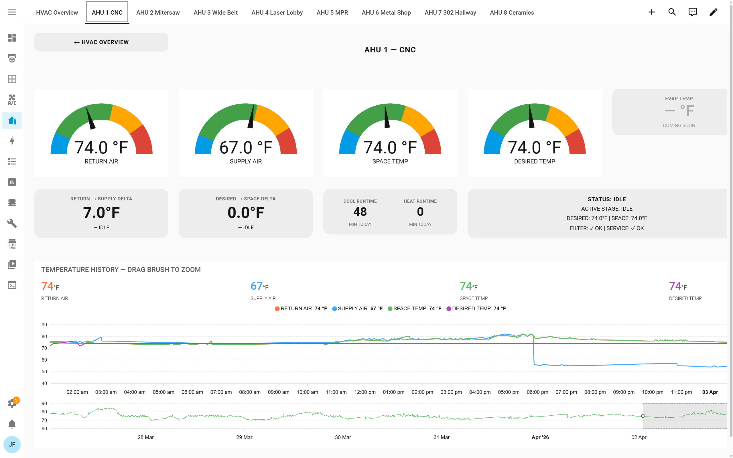 My contributions were inspired by the work done previously, and a hot day in the shop while teaching. There are a few more sensors to install, and more fault logic to explain but it gives a fairly quick health check. Here’s a current view of the AC overview: