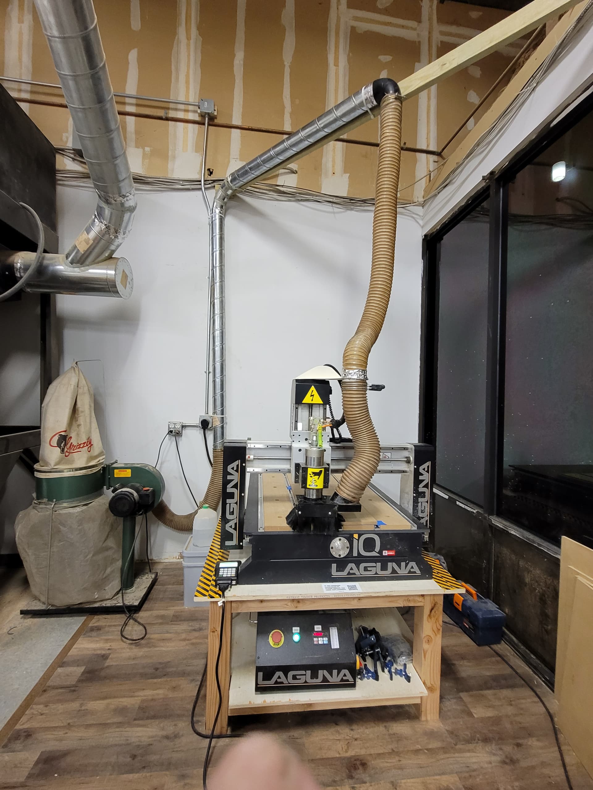 The dust collection for the IQ has been hooked up. It uses the Grizzly dust collector next to the Laguna. Future upgrades will come, but its functional now.