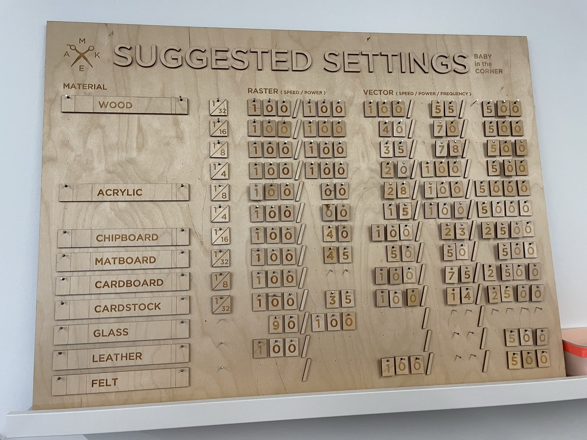 I don’t remember the settings + what @stepho said on whether they’re still accurate, but everything – including the Lightburn files – is in this folder on the Asmbly Shared drive OPEN - Projects folder – Lasered Standing Desks - Google Drive