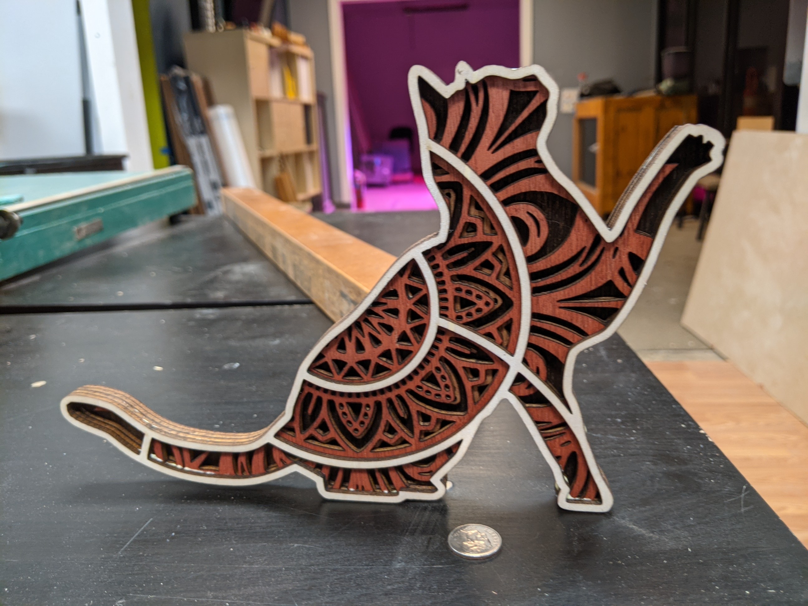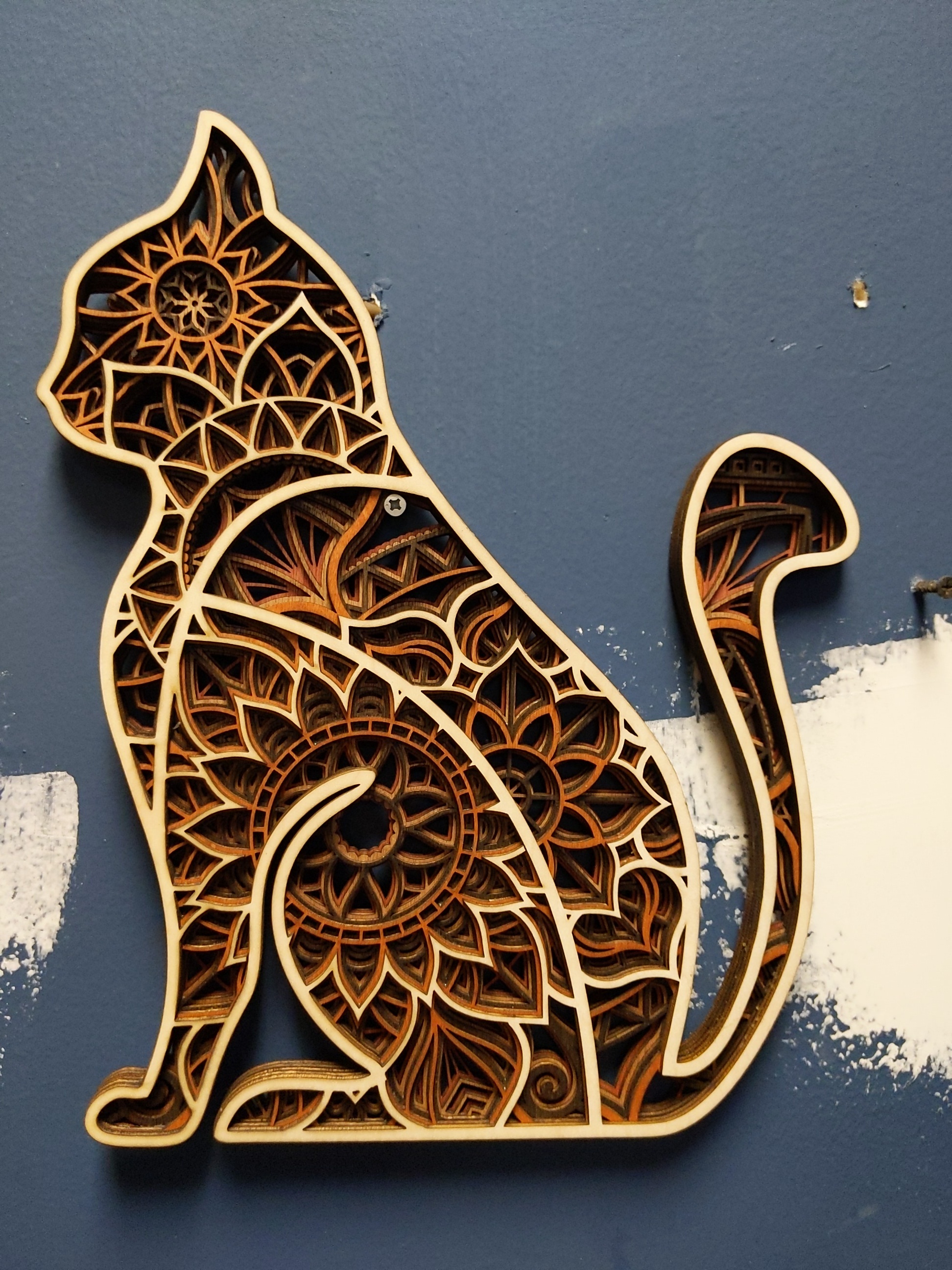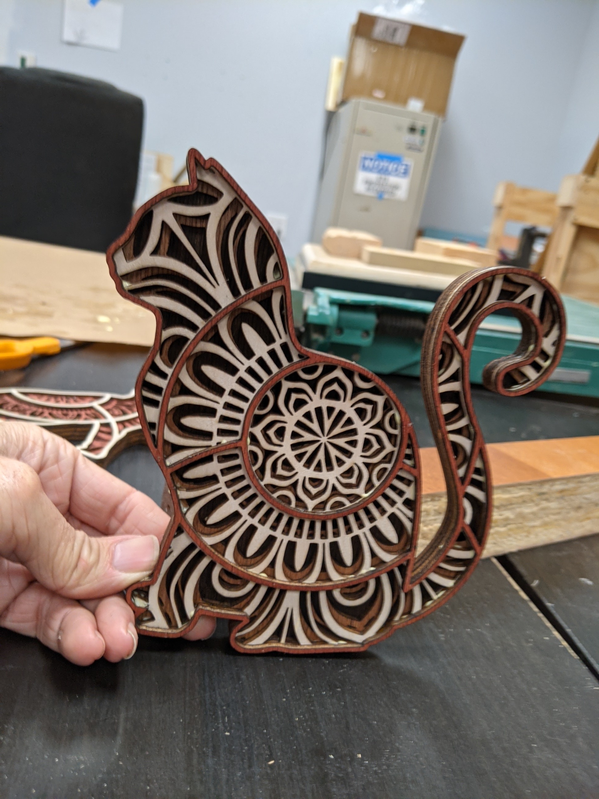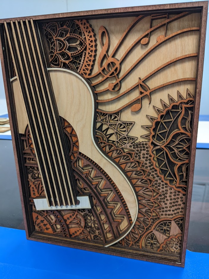 Cutting great detail is quick and easy. Gluing got easier. More layers are more work, most are 7 to as many as 11 layers. Cutting a bunch of alternating colors means cutting several layers out of order on a sheet stained that color, and you need to track carefully which layer is which and don’t put glue on the wrong side.