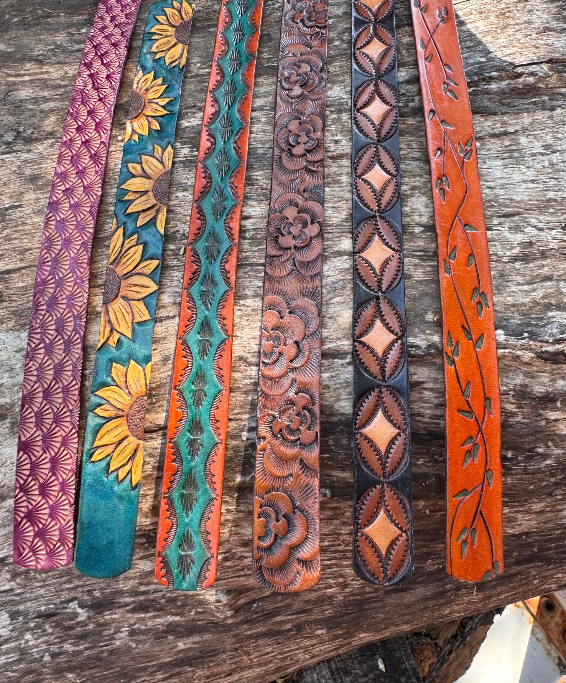 Would you like to learn something new this Saturday? Maybe make yourself something nice, or gift for someone else? Or, you might want to do something fun with a friend or loved one? I will be teaching basic leather tooling/stamping and you will go home with a wrist band of you’re own design. Examples of what you can do are pictured below.