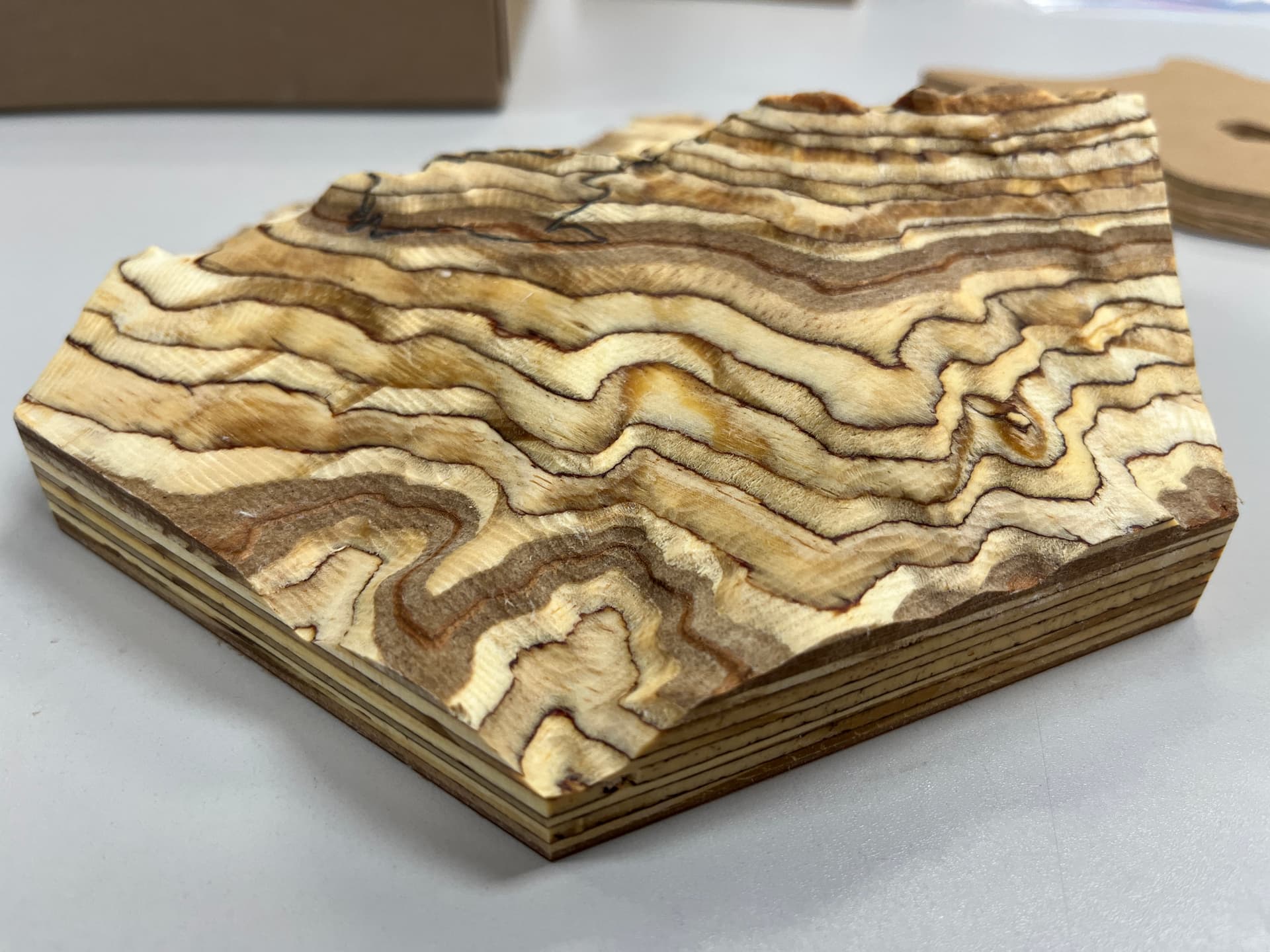 Another dope piece from Austin is this topographical map he made using trailprint3D, which is a Blendr extension. All you have to do is give it a GPS coordinate, and it will give you a topo map. In this case, the map is of a hiking trail. After grabbing the map, Austin used the fluting toolpath to cut out the map on the CNC. Terrific job.