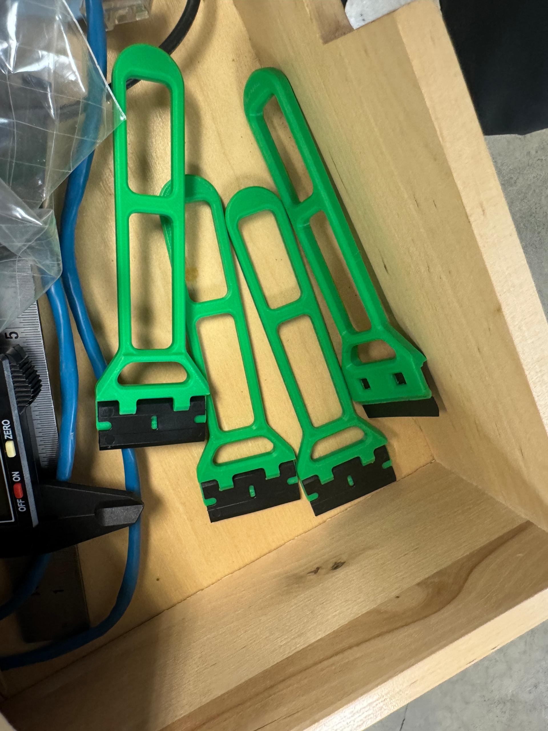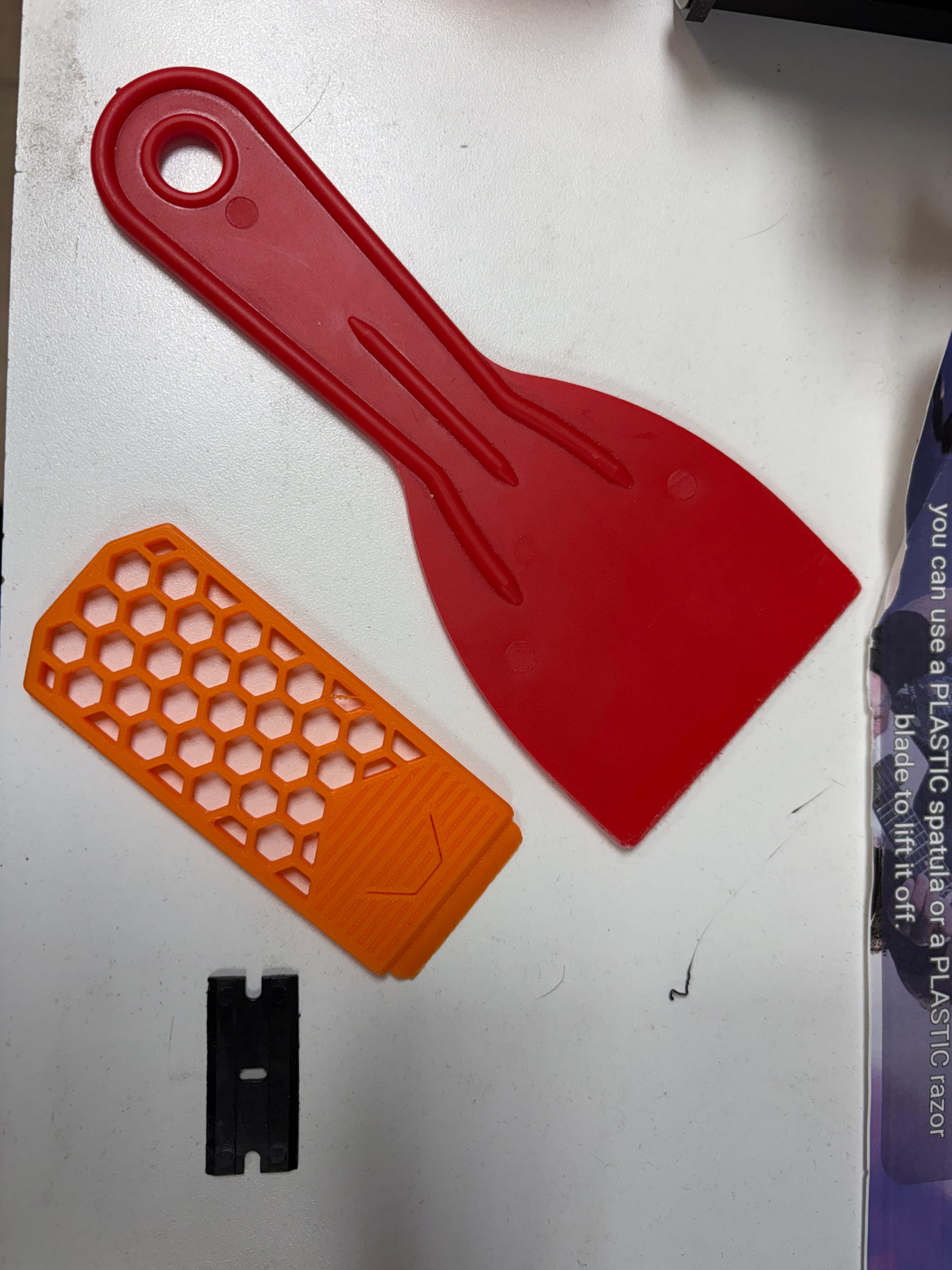 My personal favorites are the little black plastic razor blades (you can find more of these in the wooden tool table drawers), but the custom-printed orange scraper works well too. The plastic spatulas may work.