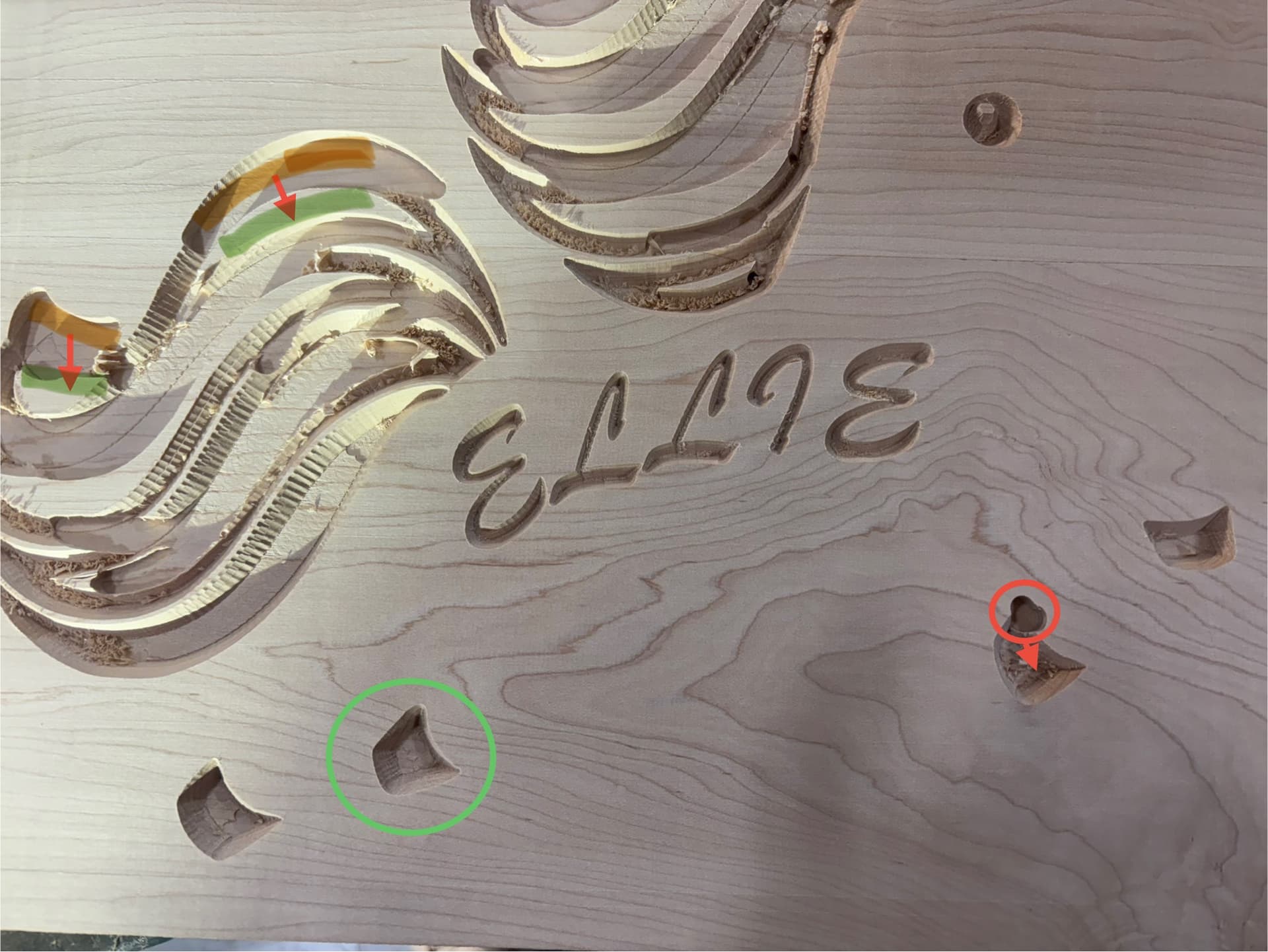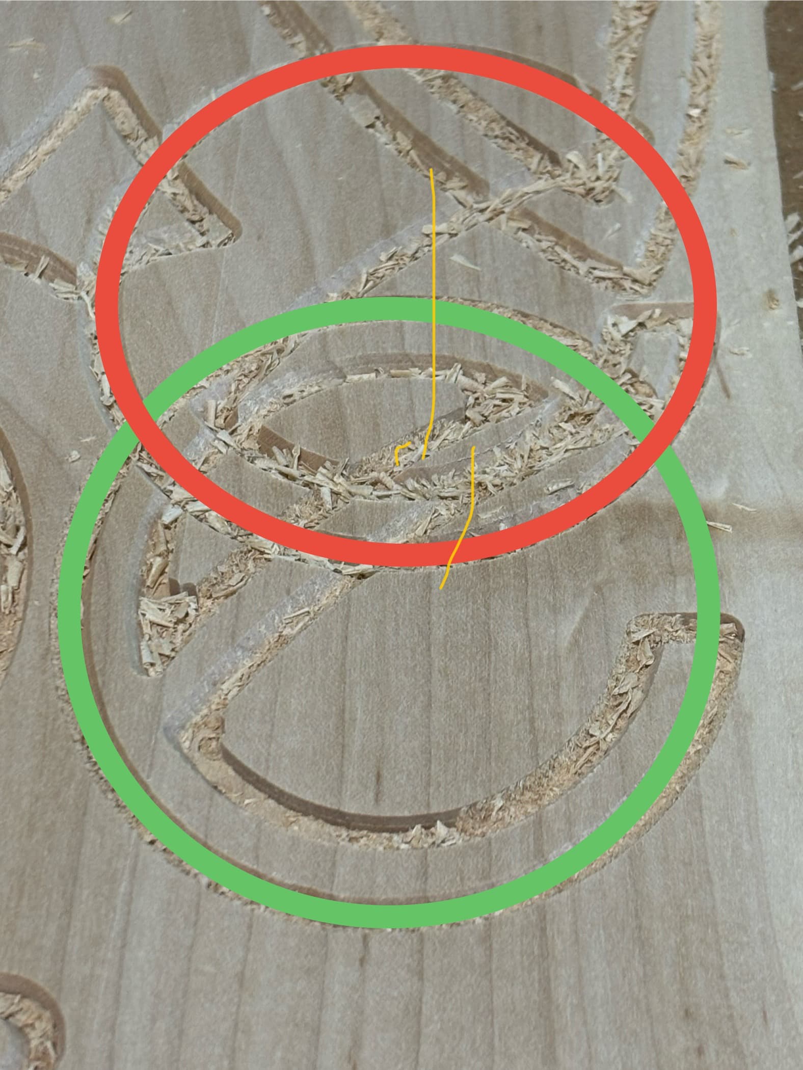 Frank’s photo shows offset in X or Y, which is a totally different problem. The orange hole is very possibly a stall point. The working axis kept moving in a straight line but the design doesn’t go far from there. There are no burn marks so the bit isn’t worn or overloaded. This could be RPM set too low, but more likely there’s a mechanical problem (gunked-up axis jamming the ballscrew or linear bearing) or electrical problem in the step/dir signals. It is unlikely the controller caused this one (possible, but unlikely).