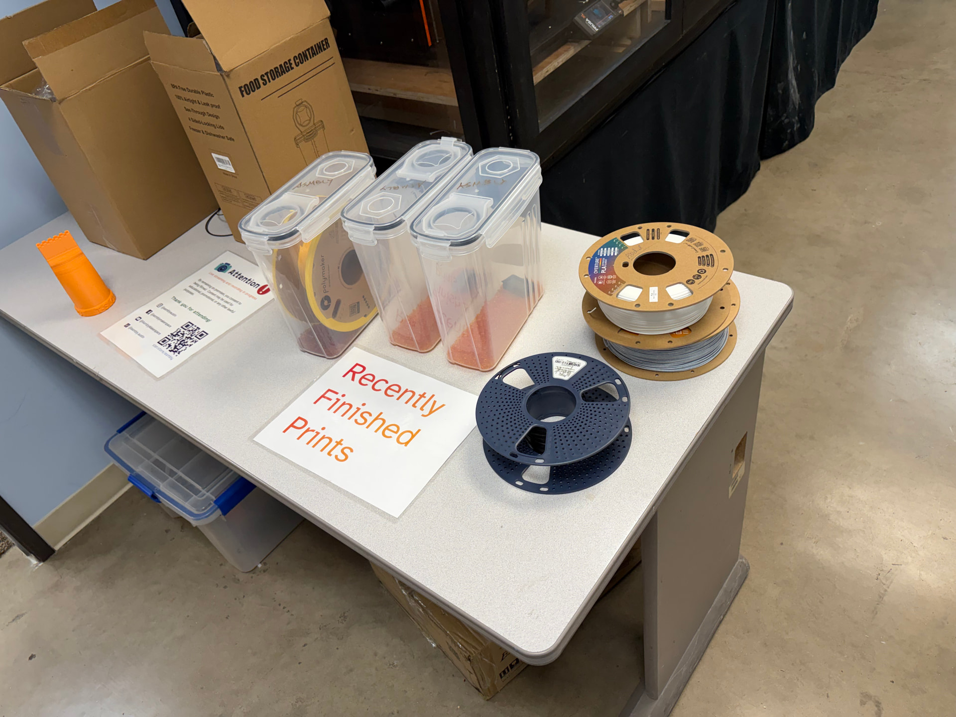 Just a friendly reminder: filament is sensitive to humidity. PLA isn’t bothered too much by it, but other filaments will print poorly if they get too “wet”. We have sealed boxes around with silica desiccant in them to keep filament dry.