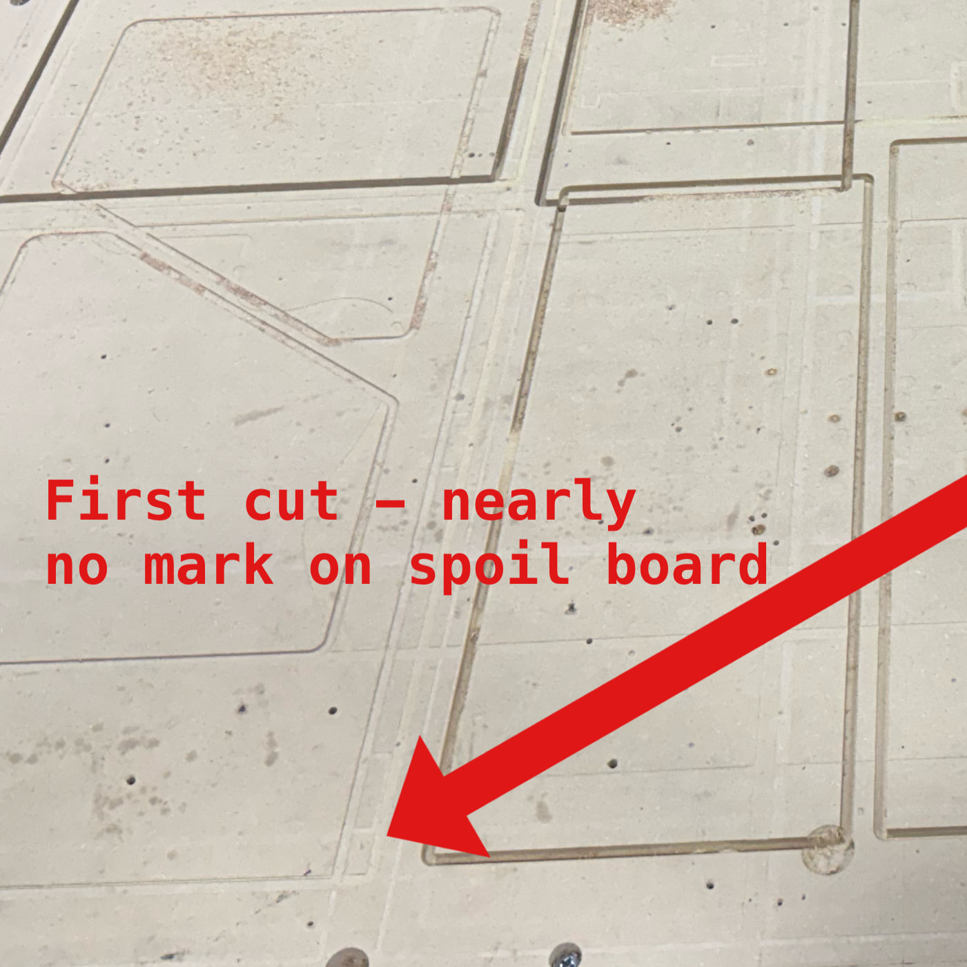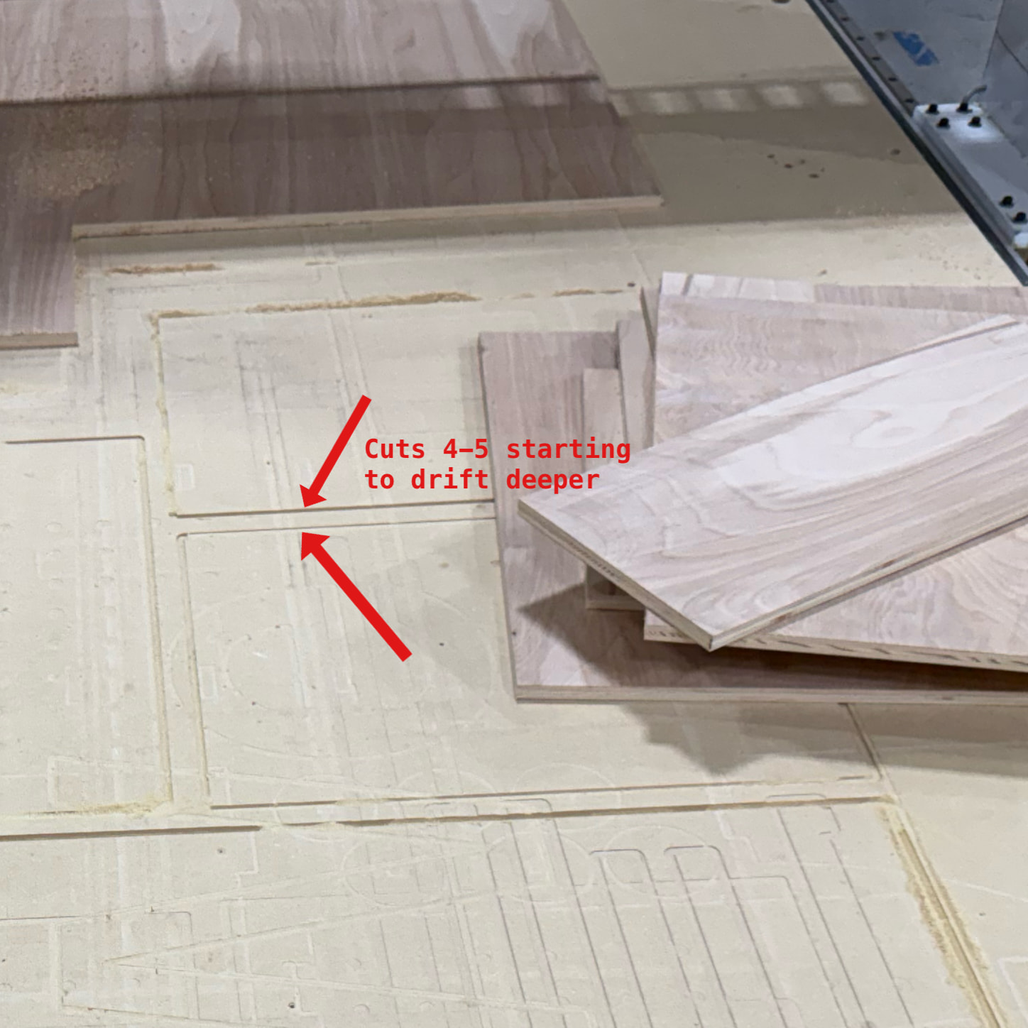 I was there frantically vacuuming because of no dust collector. I didn’t hear anything to indicate the bit had slipped, but when I got the wood off, the first few pieces had cut fine and then I could see the gradual depth increase into the spoil board across the rest of the cuts.