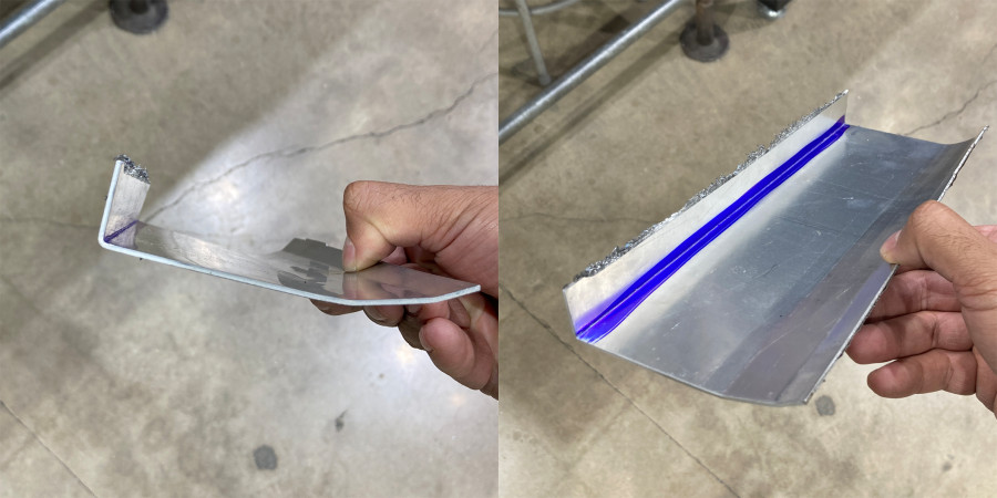 Using the 3-in-1 press brake I was able to get a 90-degree-ish bend in a test piece in 0.063” aluminum. I straightened the piece out on a table because the upper dies are not perfectly aligned. (The middle die is slightly lower and it was stuck in the jamb.)