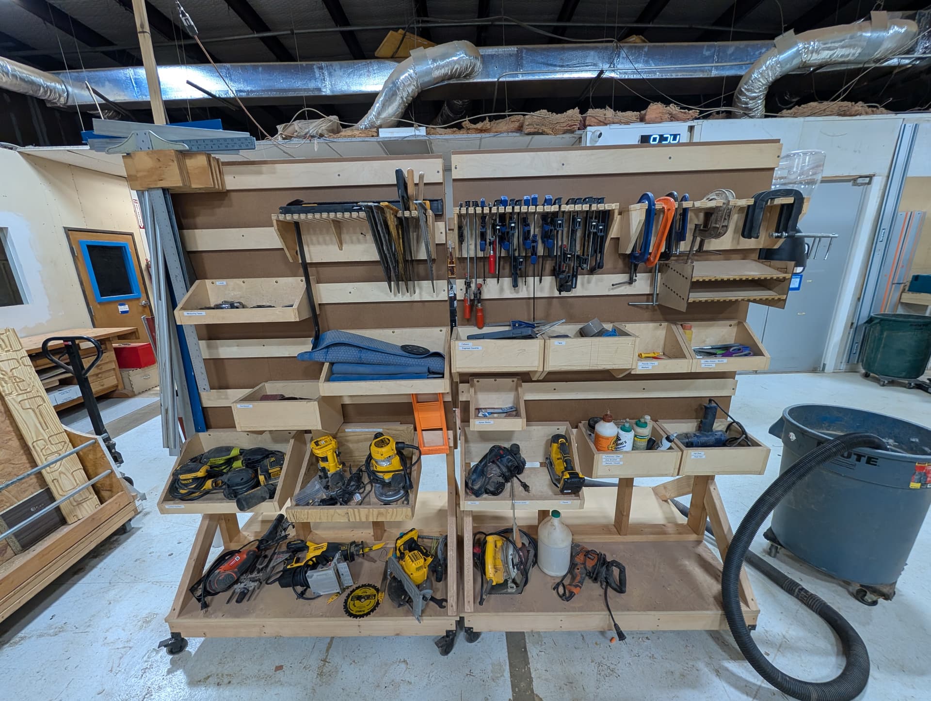 The cords have all been wrapped up nice and neat. This is a good example of how folks should keep the tool wall. Dust is inevitable, but at least folks can put things back where they got them, or on their labels, and keep it tidy.