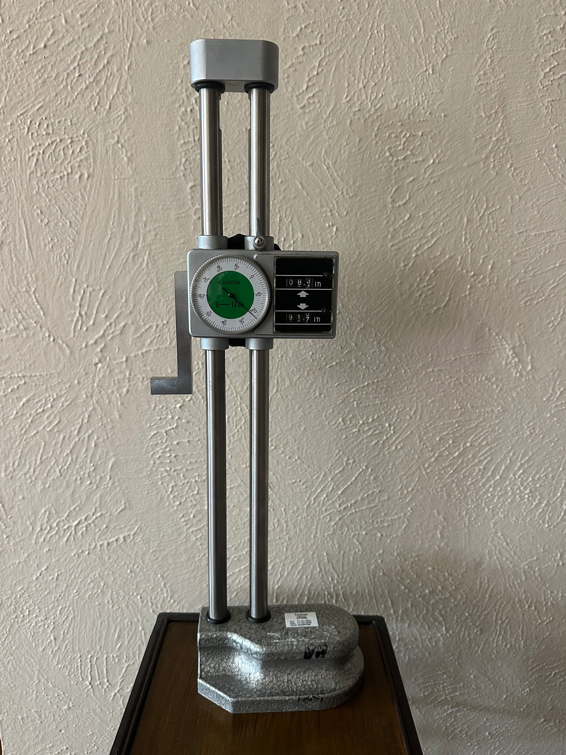 Dial height gauge, unbranded 0–12 inch. Certificate of calibration from 2022. Has a mount for a dial gauge instead of a standard height gauge mount.