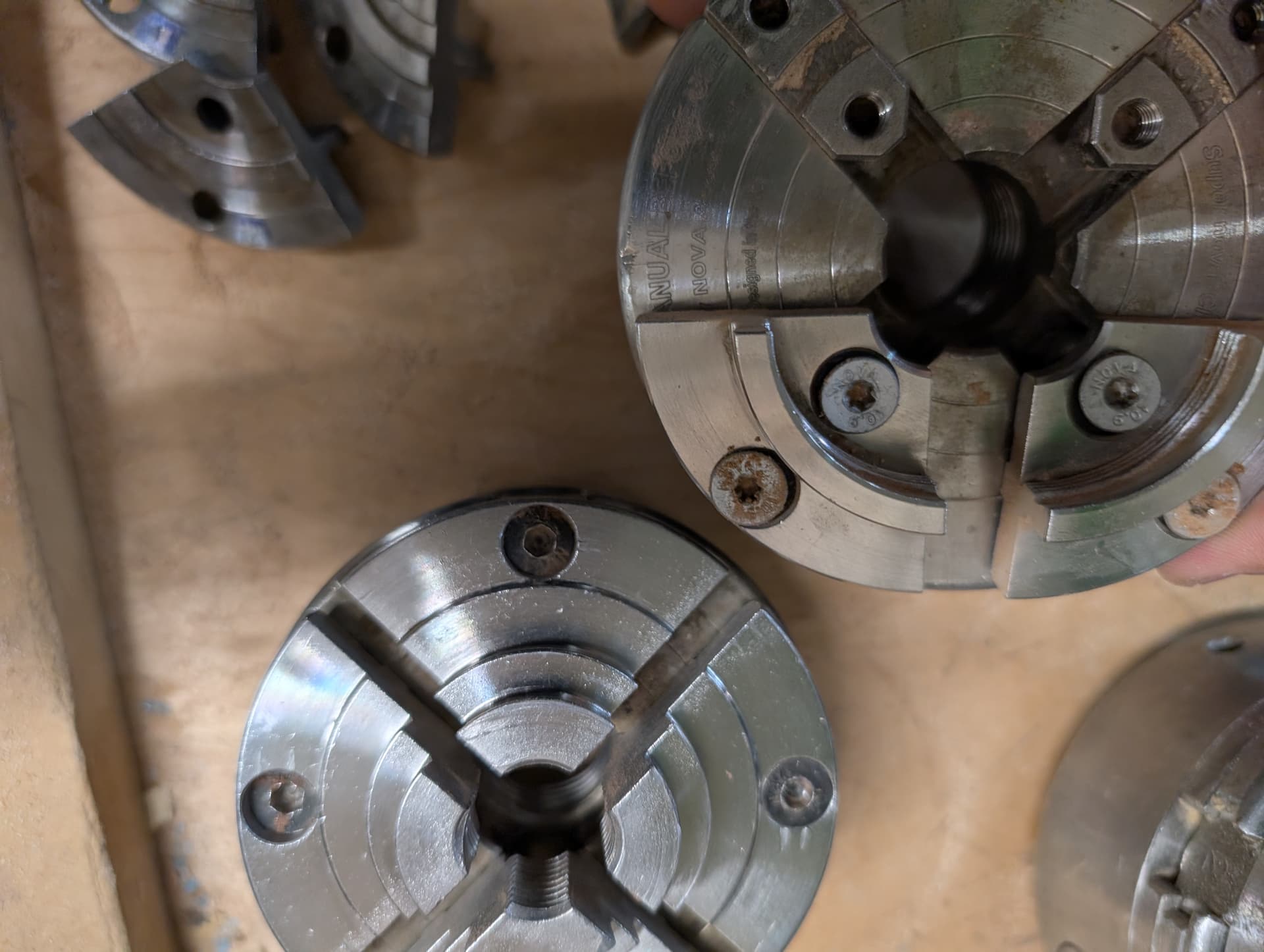 Chucks have a spiral scroll in which the Jaws are machined to fit exactly into their spot in the scroll.